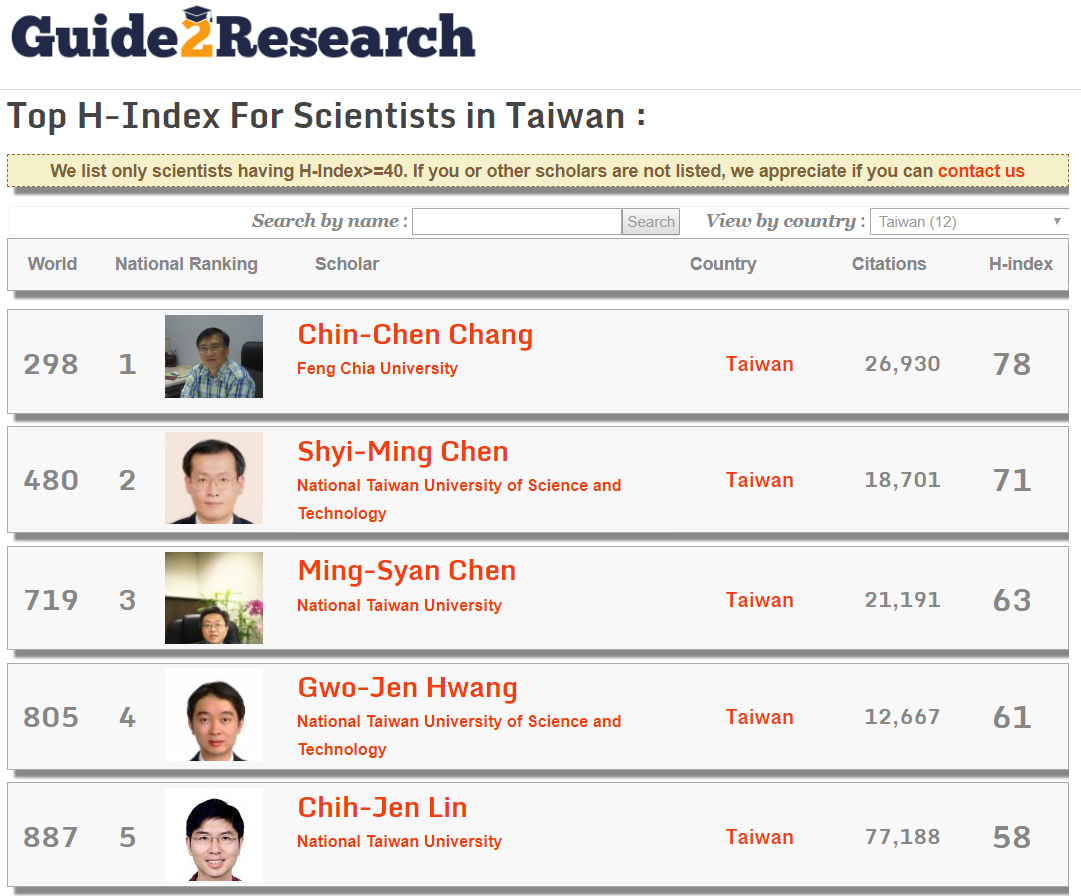 Guide 2 Research是學術界極具指標性之網站,提供全球計算機領域重要學術會議、期刊之最新資訊及影響力排名,同時也會針對科學家發表文章被引用數進行排名,而根據網站統計,張真誠講座教授文章被引用次數達26930次,H指數為78。